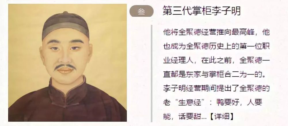 1930年升任掌柜的李子明,是全聚德历史上第一位职业经理人。在他带领下,全聚德走向了巅峰,三年时间便超越了老字号便宜坊,成为京师第一烤鸭店。